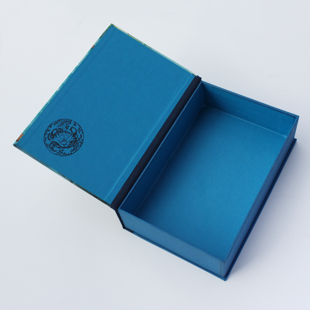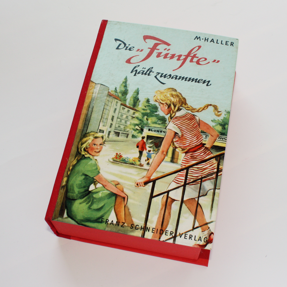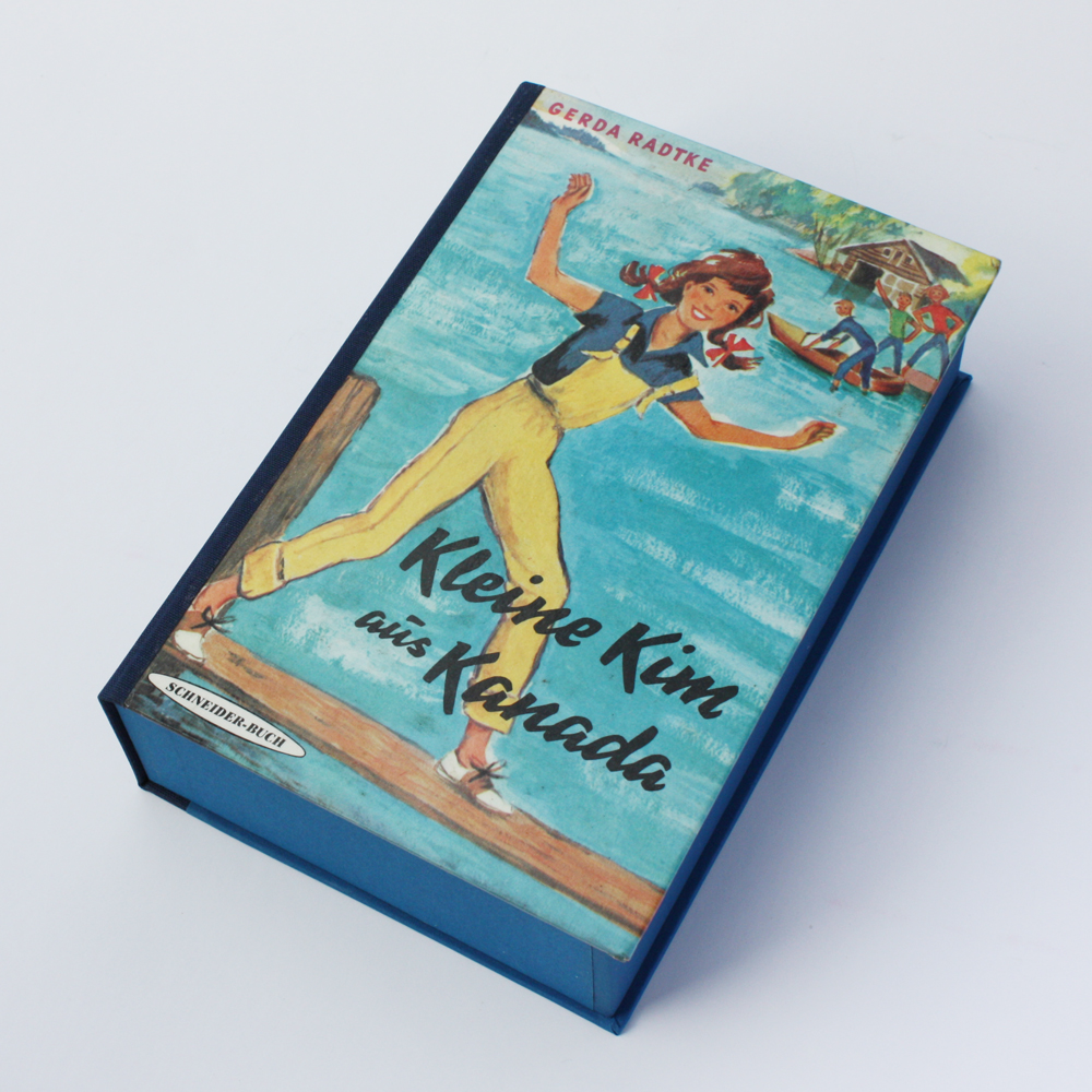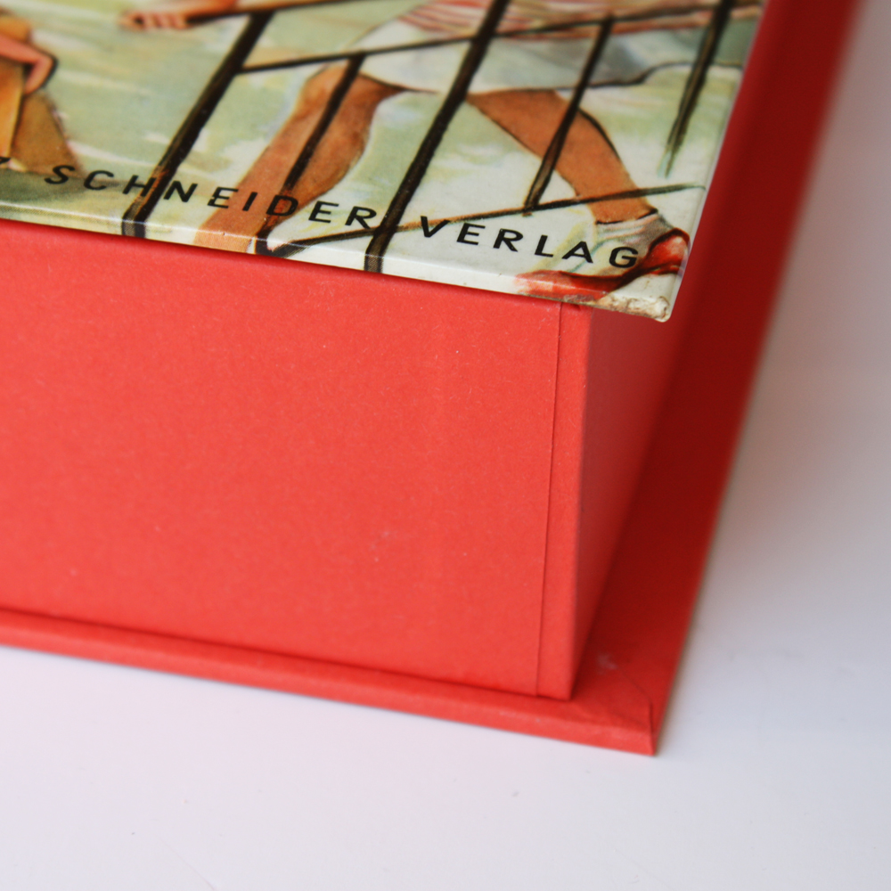 Jede Buchschachtel ist ein individuelles Einzelstück. Der Klappdeckel besteht aus einem alten Buch-Cover. Den Schachtelcorpus baue ich aus Graupappe und beziehe ihn mit farbigen Papieren. Das Cover wird – wie bei einem Buchumschlag – mit einem Gewebeband mit der Schachtel verbunden.